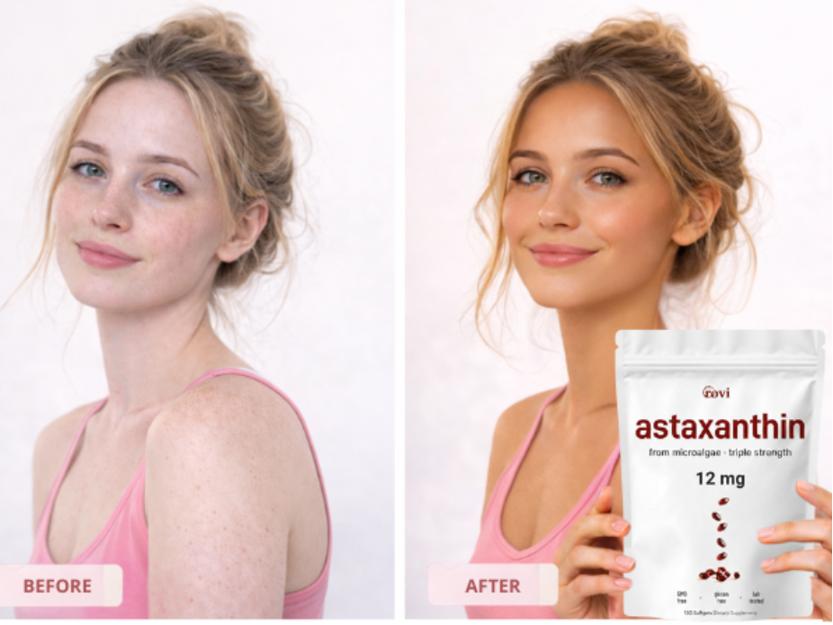 Because it's a dark red pigment (the same compound that colors salmon, shrimp, and flamingos), astaxanthin gradually builds up in the lipid layer of your skin over 3-4 weeks. This creates a warm, sun-kissed bronze glow that looks natural—not orange like fake tanners, and without the UV damage of tanning beds or sun exposure.